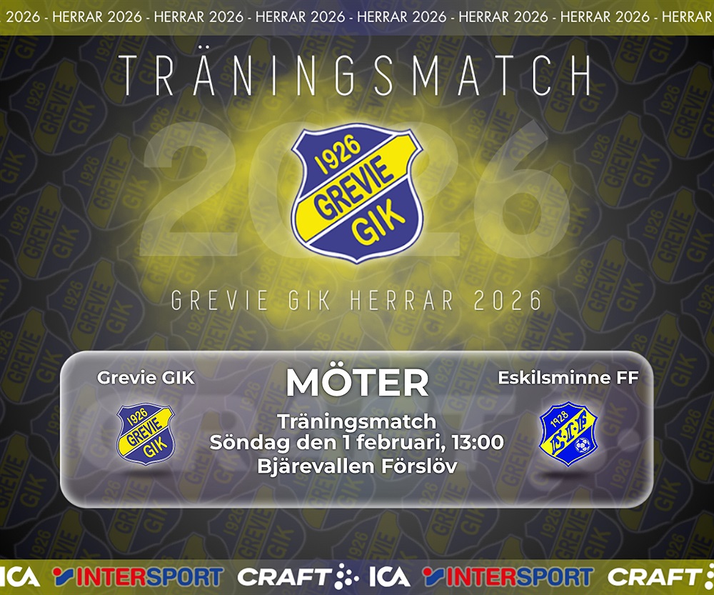 På söndag 1 februari kl. 13.00 spelar Grevie GIK träningsmatch hemma på Bjärevallen när Eskilsminne FF kommer på besök. Vi hoppas att väderprognoserna ljuger lite då det väntas snö och minusgrader. Men fram till vi vet ligger planeringen fast.