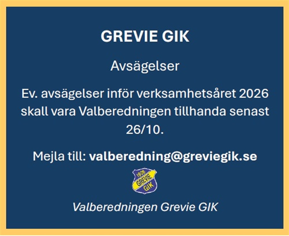 Eventuella avsägelser i Grevie GIK inför verksamhetsåret 2026 ska vara valberedningen tillhanda senast 26 oktober 2025, valberedning@greviegik.se.